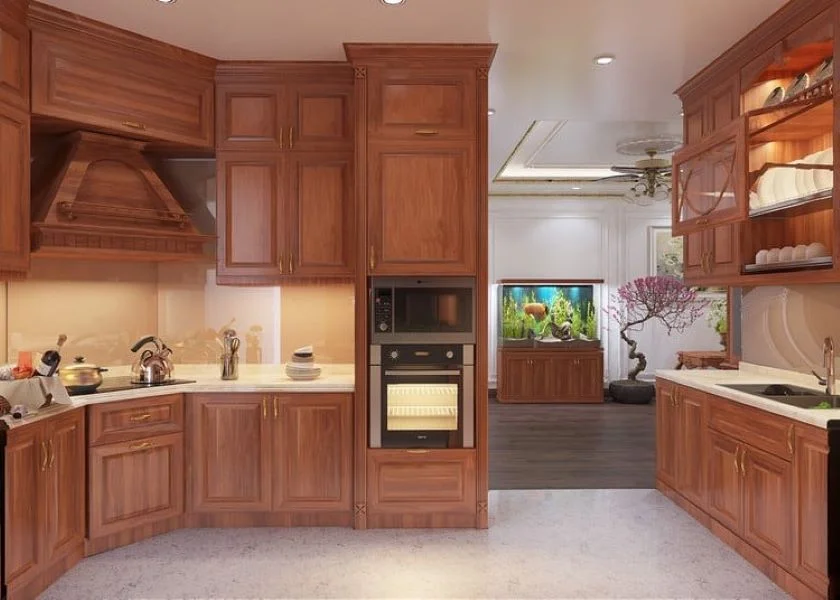 Một chiếc tủ bếp bằng gỗ có thể được chạm khắc hoa văn tinh xảo, kết hợp với nền tảng là mặt bàn đá hoặc composite đem lại vẻ đẹp hài hòa giữa cổ điển và hiện đại. Gỗ còn có khả năng cách âm tốt và giúp không gian trở nên ấm cúng hơn, điều này rất quan trọng trong một không gian bếp.