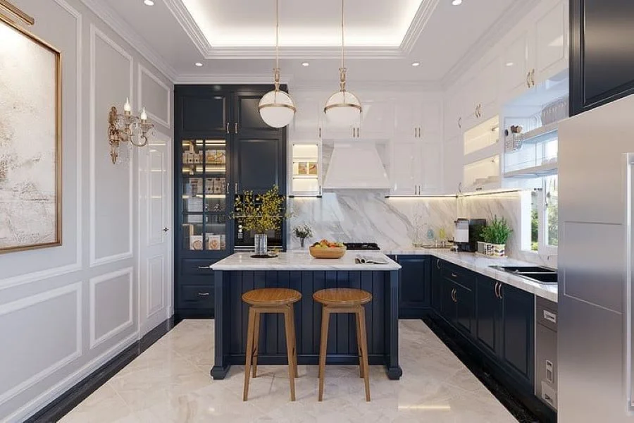 - Mẫu phòng bếp tân cổ điển chữ U: Đây là bố cục lý tưởng cho những căn bếp rộng rãi. Tủ bếp được bố trí trên ba mặt, tạo nên một không gian làm việc khép kín và hiệu quả.